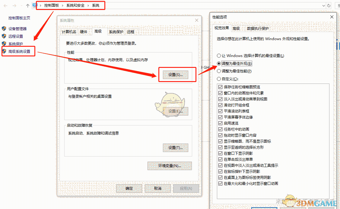 同时,需要在系统性能设置中,视觉效果设置调整为最佳外观模式: