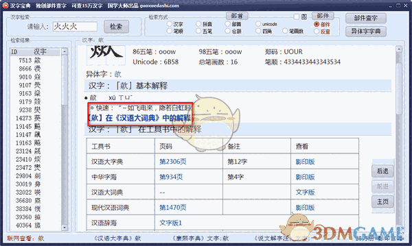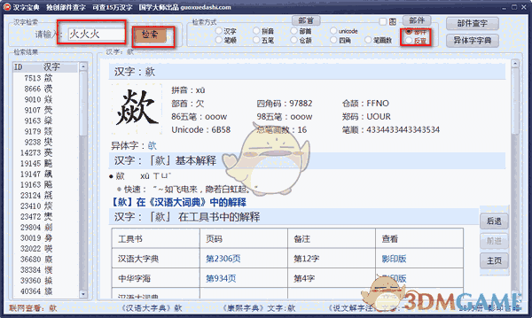 二、输入你要查询的字,比如三个火,就在上面输入“火火火”,点击检索就出来了