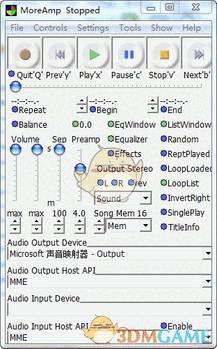 MoreAmp可以播放和制作ogg、flac、wav、aif、mp3和aac文件,并播放音频CDs和mp2、m2a、wma、mp1和m4a文件。它有一个易于使用的31波段均衡器,可变音高/速度,重复循环,等等。