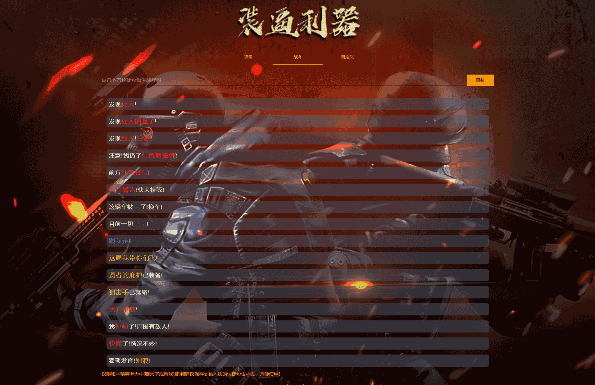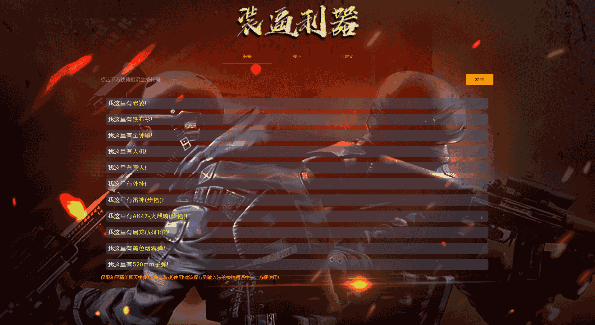 这个单页主要是用来快速生成和平精英的颜色代码,帮助你装逼!建议保存到输入法的快捷短语中去,方便使用!