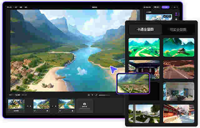 导入一张全景/6张六面体图片快速生成具有3D效果的场景,并支持参数编辑,通过创建图片帧轻松生成动态视频。