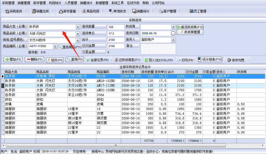 打开进入采购进货界面,依次输入您销售的商品的商品大类,商品名称,商品规格,商品编码,进货数量,进货单价,供货商,进货日期等,然后按增加,即可完成商品的采购进货。