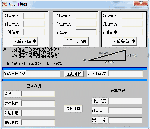 根据已知数据角度、对边长度、斜边长度、邻边长度计算相应边长。