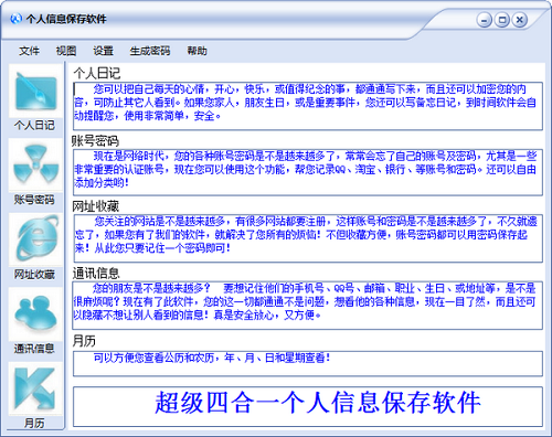 个人信息保存软件是一款多功能于一体的集合,有了此款软件您相当于同时拥有了个人日记,账号密码、网址收藏,通讯信息,这四款软件的功能,而且还可以把您不想让别人看到的某一条信息或所有信息都加密起来,只有分别有一级密码(软件登陆密码)和二级密码(信息加密密码)的您才能看到。这对您的个人隐私更加安全。