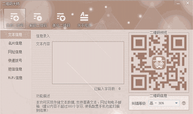 二维码大师是一款专业的二维码生成的工具软件。支持文本、手机号、邮箱地址、无线网密码等等资料生成二维码。十分方便快捷,界面简约,布局直观清晰,操作简单,极易上手,是一款不可多得的利器。