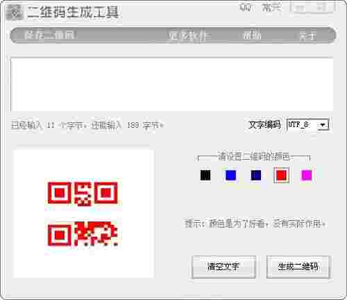 二维码生成工具是一款专业的二维码的制作生成工具软件。软件可以帮助使用者快速制作生成二维码。软件的界面非常简洁,功能布局很直观明了,软件的使用方法也很简单。在输入框中输入你所需要链接、文字等等,选择文字编码和二维码颜色,点击生成二维码即可。