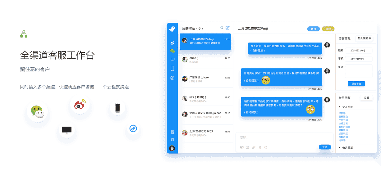 云雀客服平台是一款专业的客服软件,软件支持微信和微博双平台登录同时还支持电脑和手机多端同步操作,软件有多种实用功能来辅助客服工作,是一款非常不错的客服软件,感兴趣的朋友可以在本站下载体验。