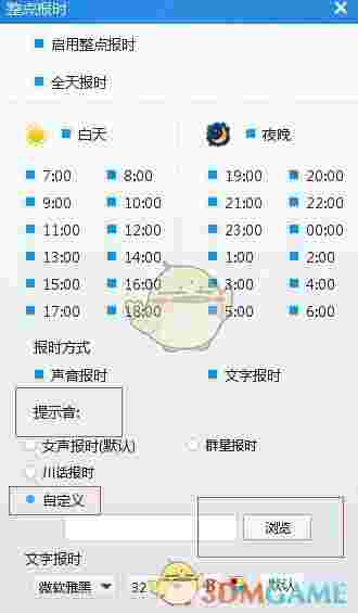 3、在这里我们点击浏览将自定义的语音报时文件添加进来后就可以使用了。需要注意的是自定义的音乐命名规则为: 00 01 02 03