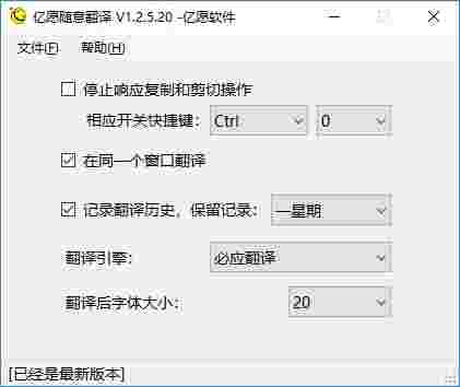 在界面可以选择4种翻译引擎之一;可以设置在同一个窗口打开或是不同的窗口打开翻译;可以设置字体大小;可以通过快捷键开启和暂停响应复制和剪切操作