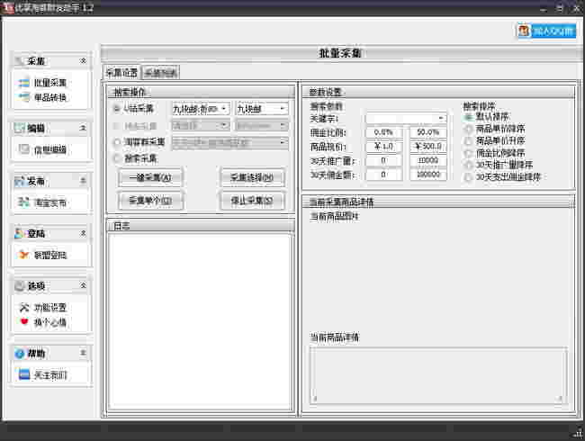 搜索采集:对所有参加淘宝客推广的商品进行搜索,支持设置关键字、佣金比例、商品现价、30天推广量、30天佣金额五个参数,可按系统默认、单价、佣金比例、30推广量、30天支出佣金进行排序采集。