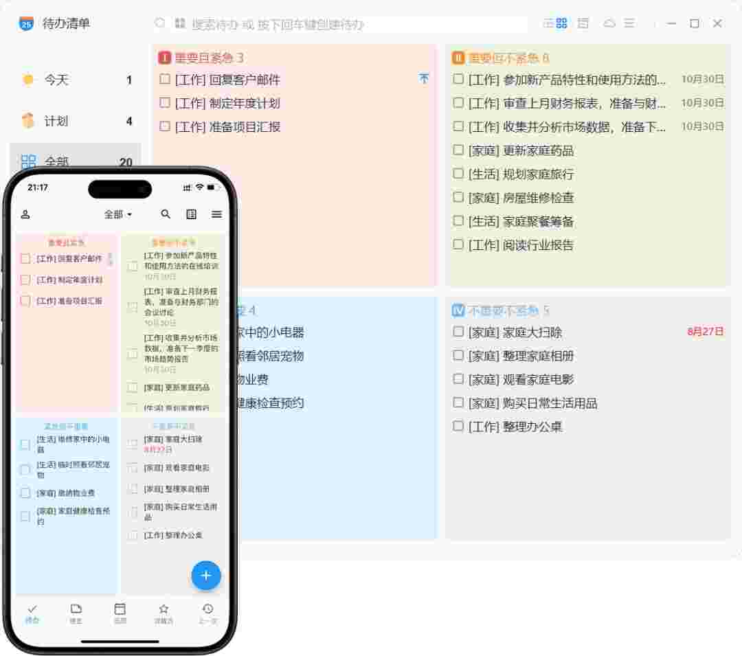 待办事项:让你高效的完成最重要的事情,支持列表视图/四象限视图查看待办事项,可以为每个待办事项启动番茄时钟。