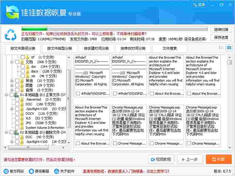 6、分类详细,不仅按目录分类,还按文件类型、文件创建时间、文件修改时间分类,找文件更方便! 恢复步骤: 第一步、运行佳佳数据恢复软件。