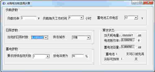 光电电池板选用计算输入负载参数和负载每天工作时间,蓄电池工作电压,以及当地有效日照时间,光电电池板选用计算免费版可计算出当蓄电池充满电时间,以及实际可工作时间。