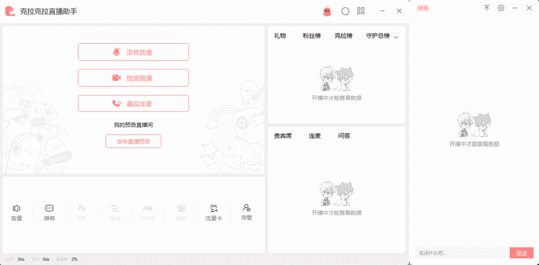 克拉克拉直播助手是一款功能强大的直播辅助软件,软件操作简单易用,提供有趣的玩法,比如连麦玩法,多人语音连线,打破空间限制,支持礼物、粉丝榜、克拉榜、守护总榜、贵宾席、连麦、问答等信息,让直播内容更精彩,满足用户的多样化社交需求,感兴趣的小伙伴不妨下载体验一下吧!