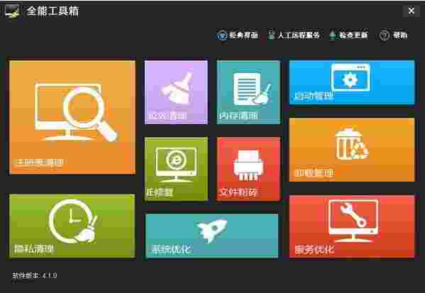《全能工具箱 v4.1.0》是一款系统清理维护的软件,这款软件集合用户隐私清理,系统垃圾清理,系统性能优化及ie修复等功能,软件内的功能非常丰富,操作也很简单,是一款非常不错的软件,有需要的小伙伴快来下载叭!