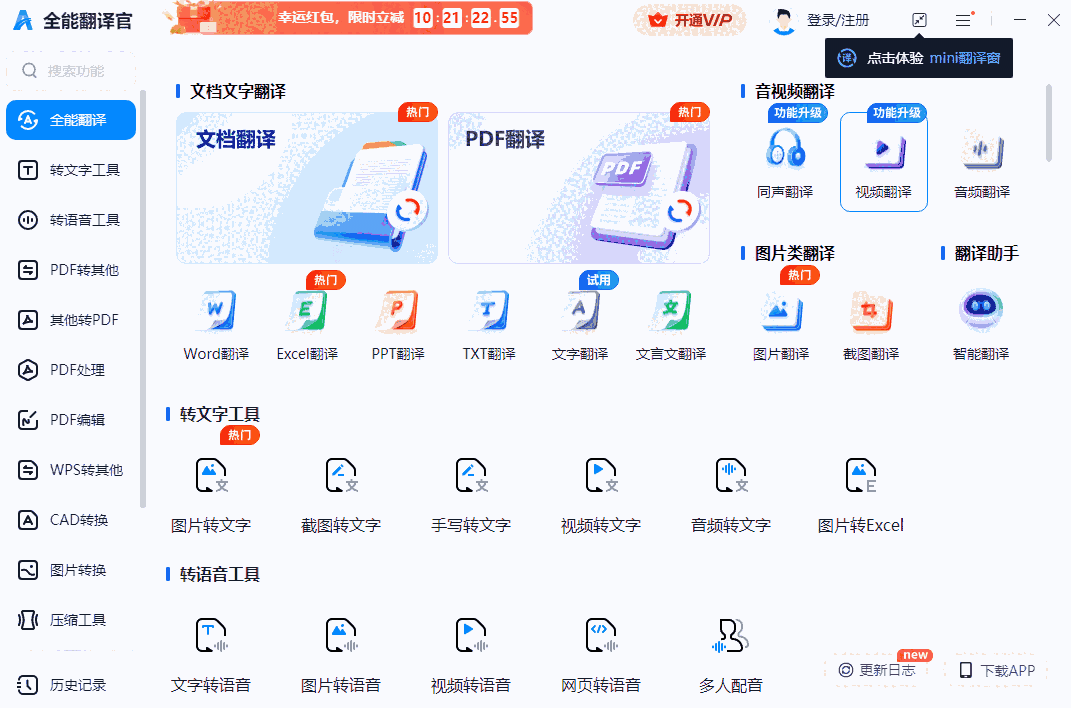 全能翻译官Mac版是一款非常实用的在线自动翻译器,软件界面简洁,风格美观,支持英语、日语、韩语、粤语、文言文等语言在线翻译,提供文档翻译、PDF翻译、图片翻译等翻译工具,可以轻松满足音视频翻译、图片翻译、文档翻译的需求,解决翻译问题,提高工作效率,感兴趣的小伙伴赶快下载使用吧!