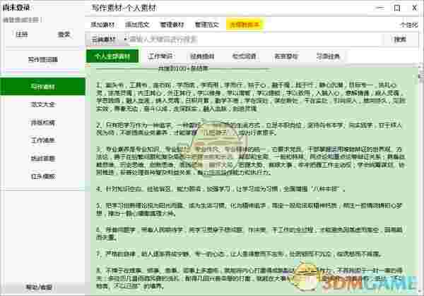 素材共分为工作常识、经典提纲、句式词语、名言警句、习语经典5类,同时分为2个板块: