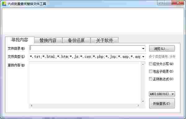 六点文件批量查找替换工具是一款专业的文件的批量查找替换工具软件。软件可以帮助使用者查找文件内容、替换文件内容、备份文件内容。软件体积小巧,软件界面、功能布局非常直观、明显,因此上手使用也比较轻松,使用方法也很简单。