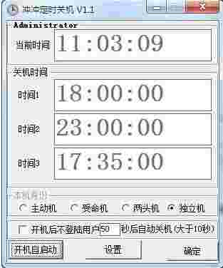 冲冲定时关机是一款专业的定时关机的工具软件,软件可以设置三个时间来自动定时关机,除此以外,还支持远程关机,十分方便快捷,界面简约,布局直观清晰,操作简单,极易上手,是一款不可多得的利器。