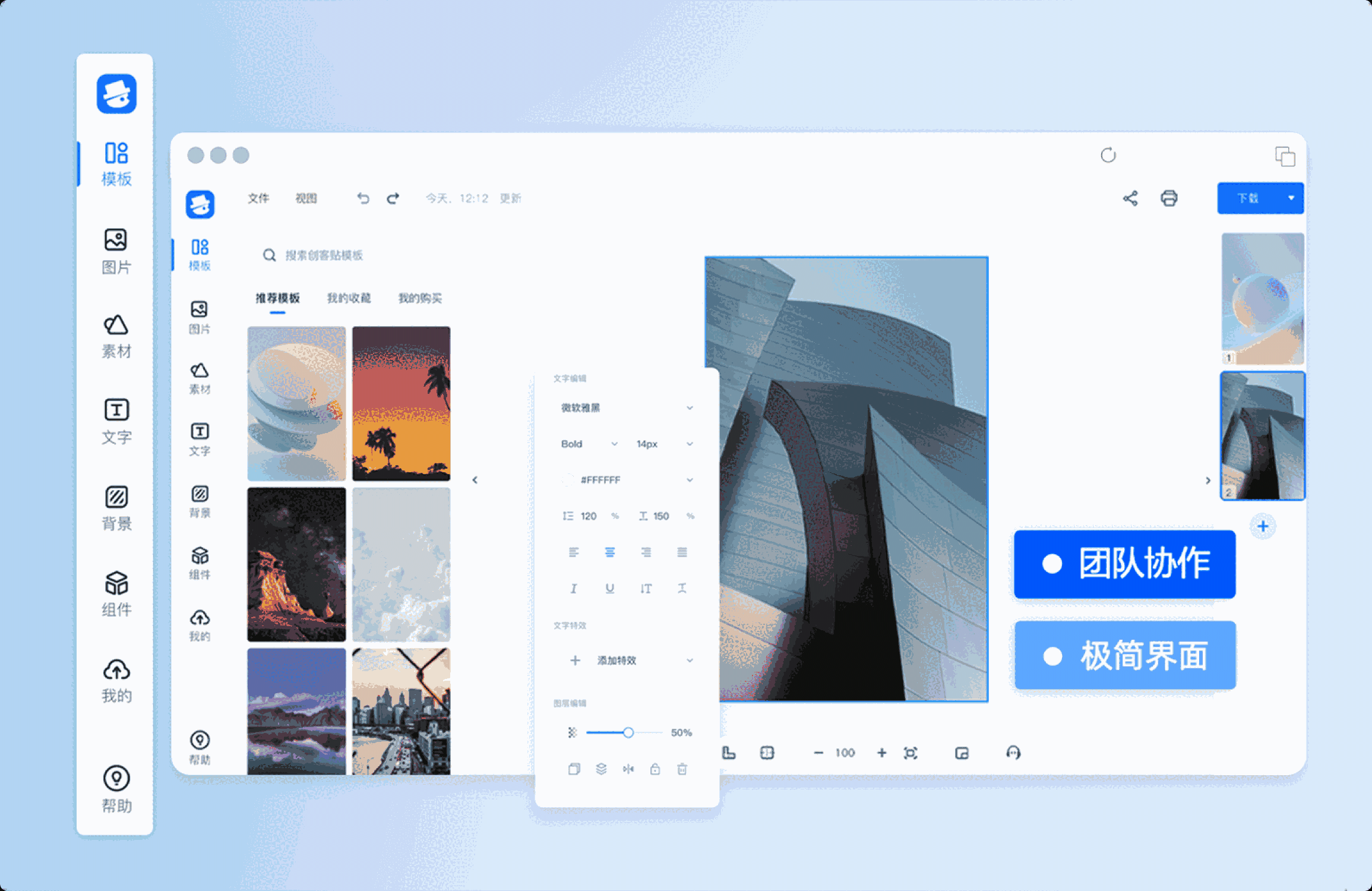40w+设计模板和图片素材全部由专业的设计师创作与提供,每一张图片均可进行在线编辑,选择模板,简单修改文字、替换图片等操作即可一键生成设计,免费保存至相册,非专业设计师也能轻松拥有设计超能力。