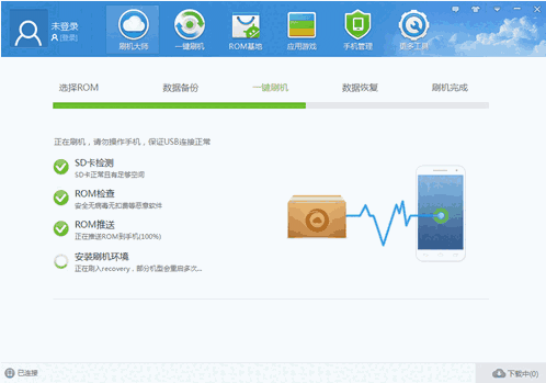 5、进入一键刷机后,会经过SD卡检测、ROM安全检查、ROM推送到SD卡、安装Recovery环境几个流程,我们需要耐心等待!