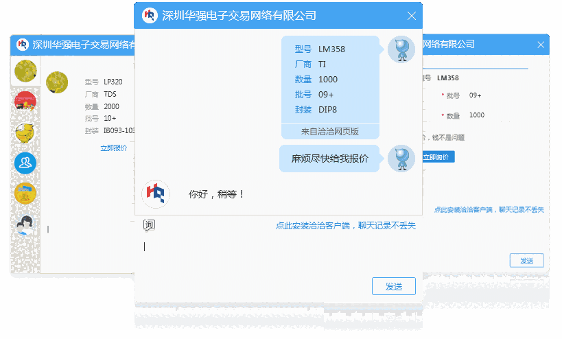 询价客户太多,无法马上回复?企业洽洽帮你科学分配客服,hold住客户!只要有一个客服在线,即使主账号不在线,在华强电子网上显示的企业洽洽图标都是在线状态。