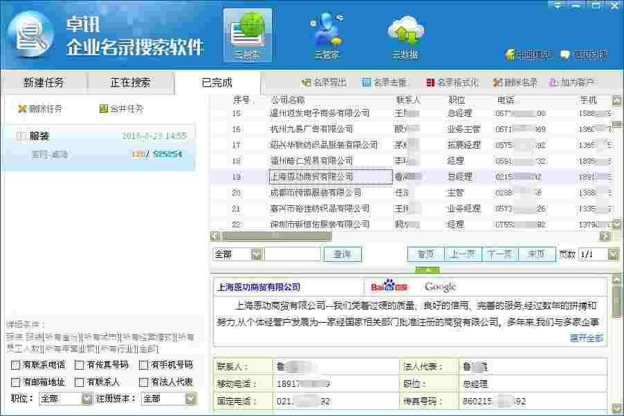 拥有全面的搜索结果:公司名称,姓名,称呼,职务,电话,移动电话,传真,地址,邮编,Email,公司主页,公司介绍,主营产品或服务,主营业,企业类型,经营模式,注册资本,公司注册地,员工人数,公司成立时间,法定代表人或负责人,主要客户,主要经营地点,经营品牌,管理体系认证,是否提供OEM代加工,质量控制,研发部门人数,厂房面积,工商注册信息.