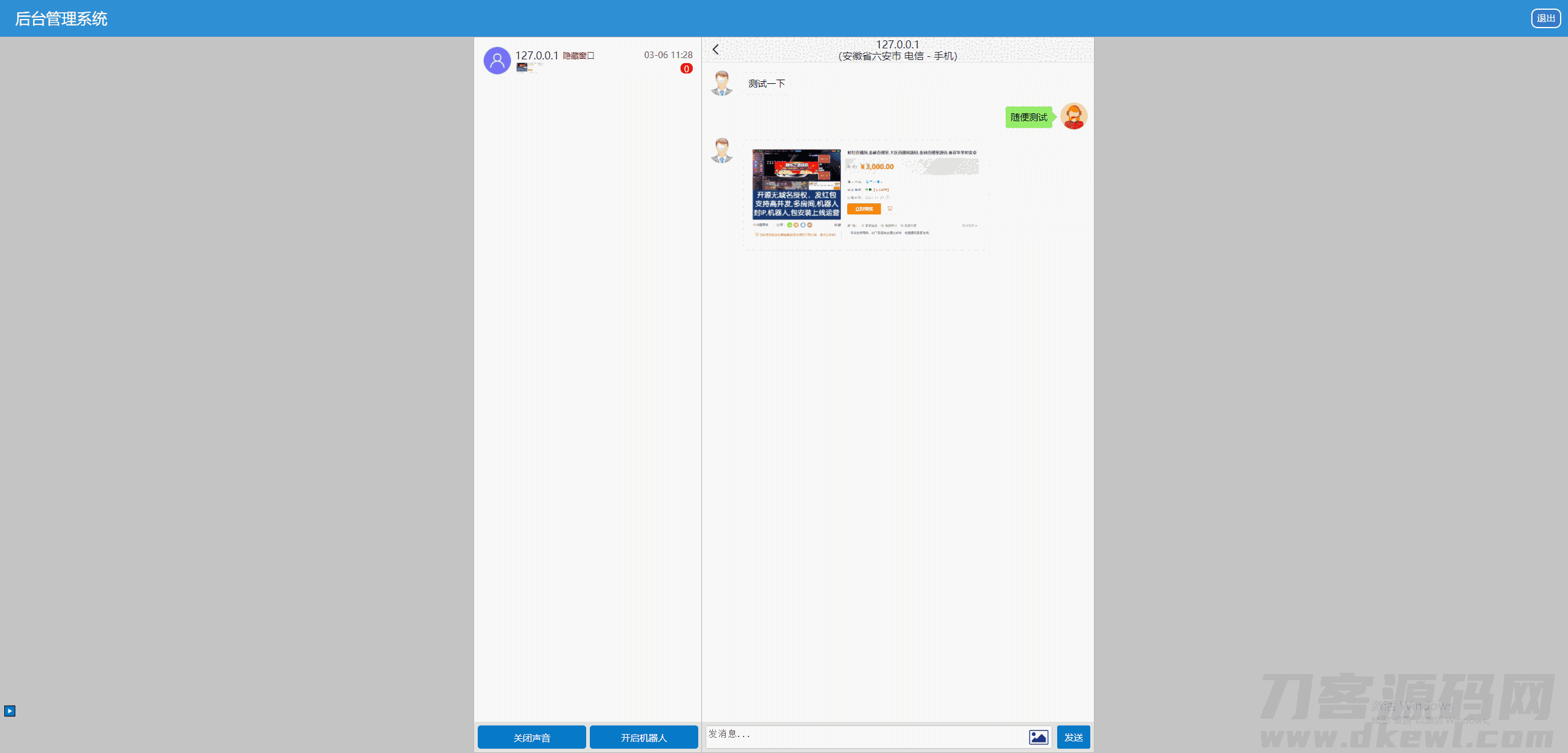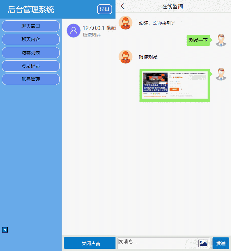 2,后台会话窗口增加了显示会话者IP对应地址及运营商(使用第三方接口,如第三方接口出问题,免费更换接口,但不得以此理由退款)
