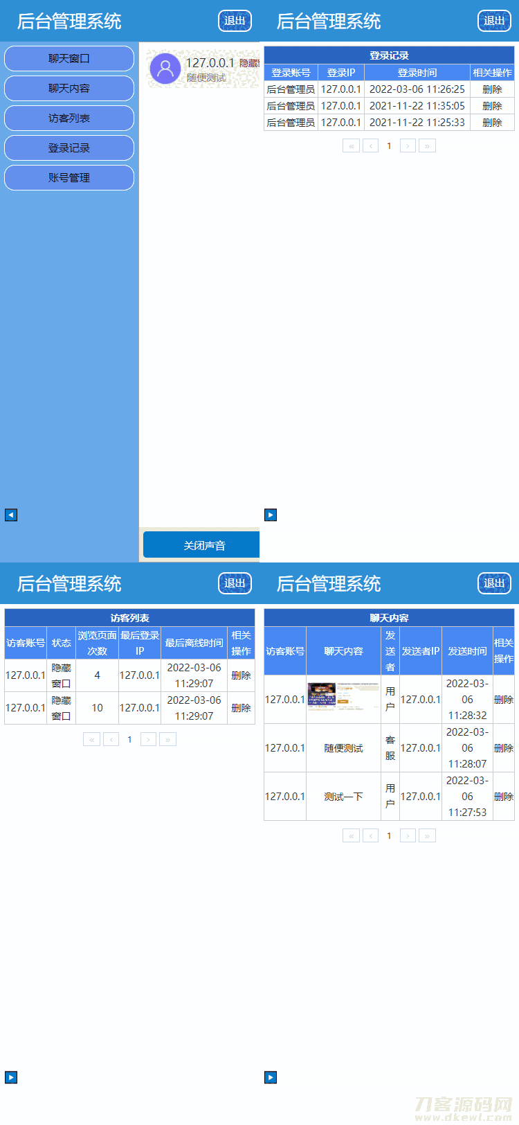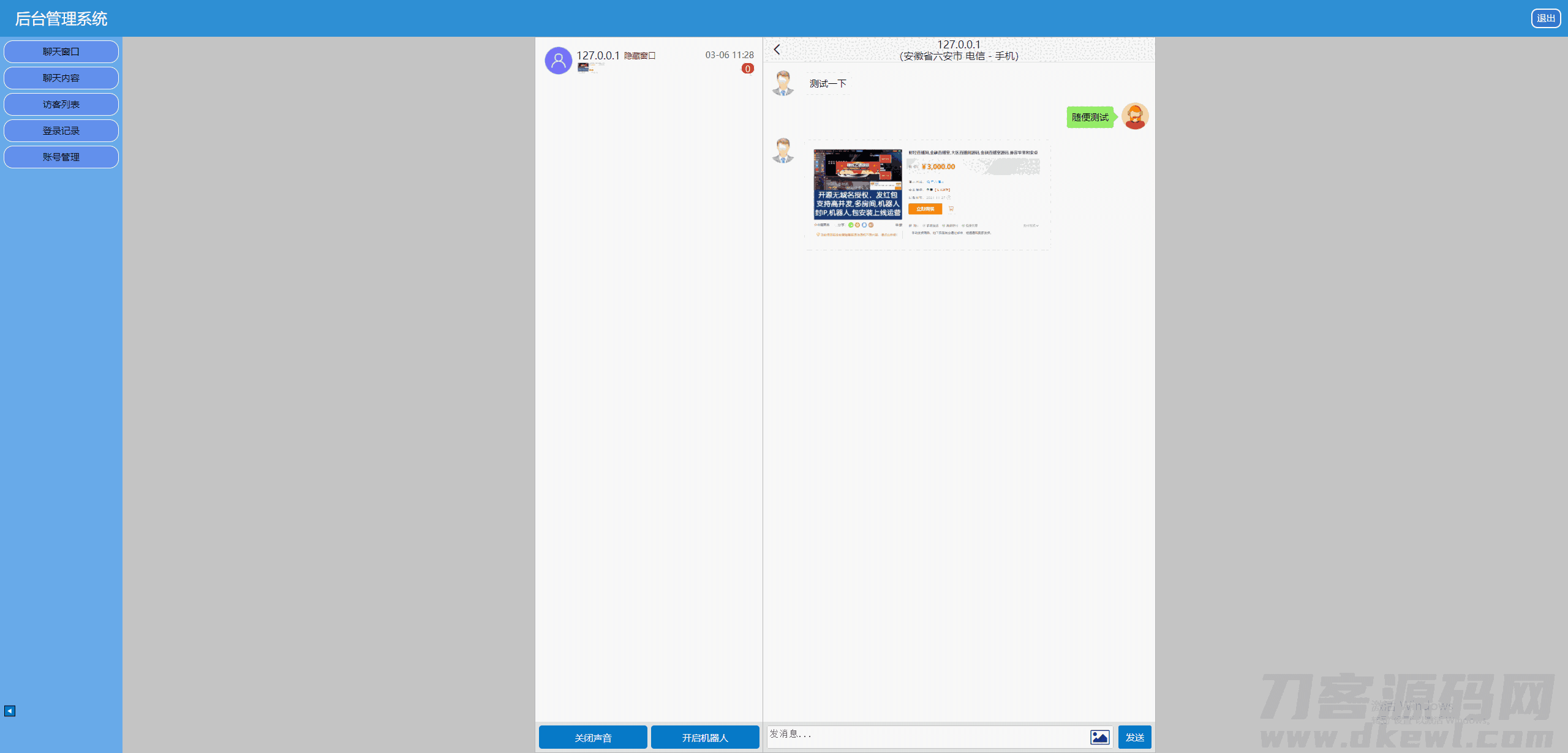 2,后台会话窗口增加了显示会话者IP对应地址及运营商(使用第三方接口,如第三方接口出问题,免费更换接口,但不得以此理由退款)