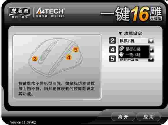 双飞燕一键16雕是一款专业的键鼠辅助的软件工具,软件可以为你的鼠标设定提供16种功能如听音乐、文档页面滚动等等。非常方便快捷,软件界面简约,布局直观清晰。操作简单,容易上手,是一款十分实用的工具。