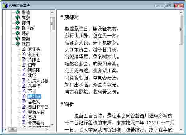 古诗词曲赏析是一款专业的古诗词鉴赏分析的软件工具,软件囊括了历朝历代的赋、歌、诗、词、曲等等文学载体。十分方便快捷,界面简约,布局直观清晰,操作简单,极易上手,是一款不可多得的利器。