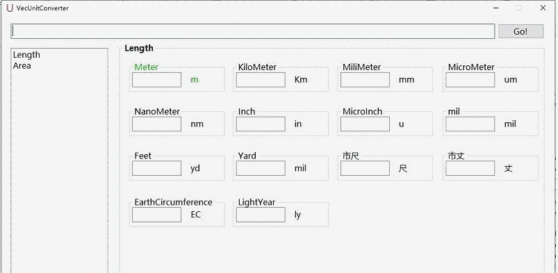 输入Value + UnitName(不区分大小写),如1km或1 km(Value和UnitName之间的空格是可选的),将显示与长度有关的单位,并将焦点放在标签名称为km的文本框中,并将自动进行转换。