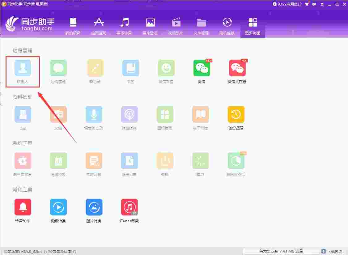 下面小编介绍一下通讯录的备份与恢复,打开同步助手点击“更多功能”——”联系人“,这时就可以看到在设备中所有的通讯的信息了,然后可以选择“新建联系人”“删除联系人”“导入”与“导出”,这个“导入”与“导出”就是“备份”和“恢复”。