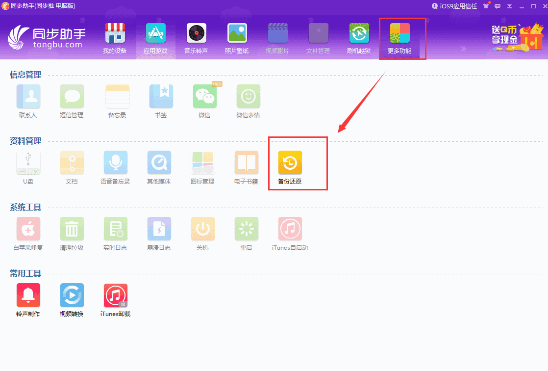 使用同步助手备份资料,可点击打开同步助手之后将选项卡切换到【更多功能】,在这里选择【备份还原】,点击【创建备份】就可以了。操作非常简单,这里就不详细为大家介绍了。