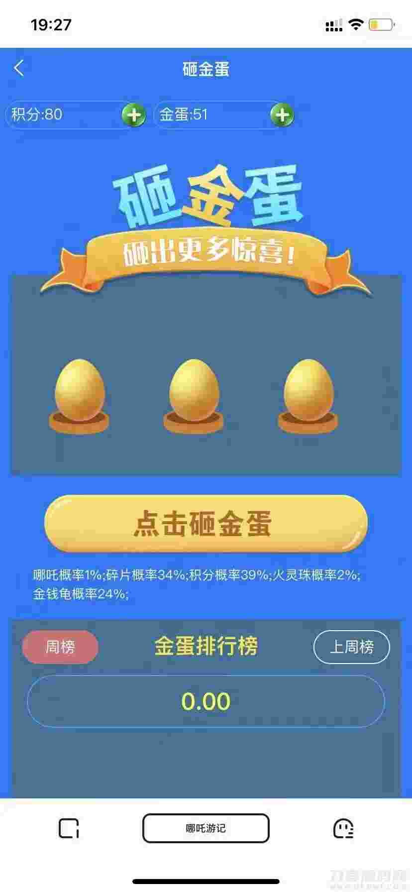 砸蛋可设置概率获得积分、哪吒、碎片、火灵珠、金钱龟。