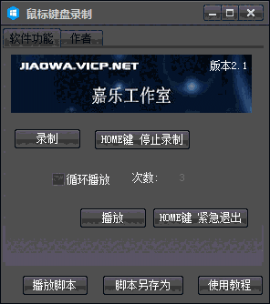 点击【播放】按钮即可播放录制的脚本,如果要循环播放,选择“循环播放”选择框,设置循环播放的次数,按键盘“Home”键可以停止