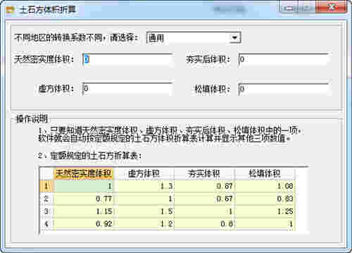 只要知道天然密实度体积、虚方体积、夯实后体积、松填体积中的一项,软件就会自动按定额规定的土石方体积折算表计算并显示其他三项数值。