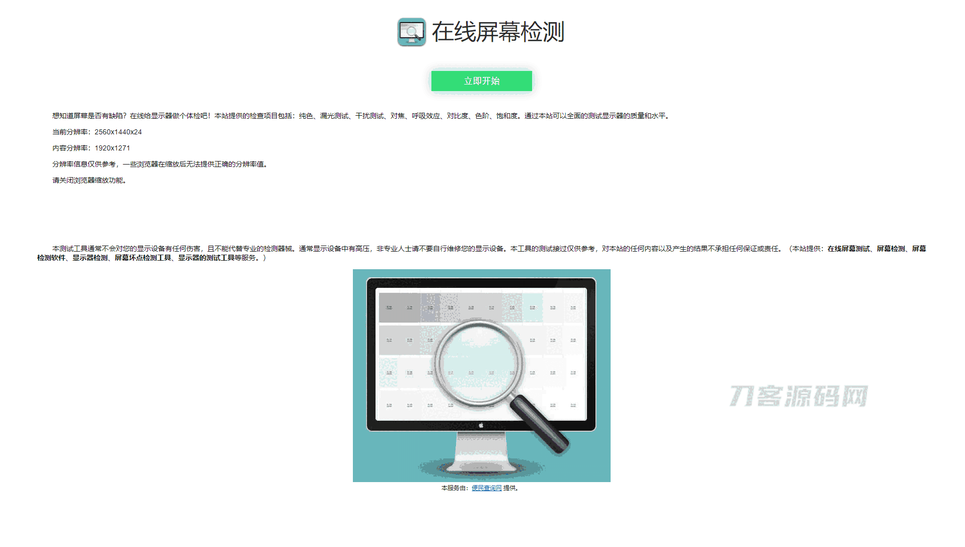 想知道屏幕是否有缺陷?在线给显示器做个体检吧!本站提供的检查项目包括:纯色、漏光测试、干扰测试、对焦、呼吸效应、对比度、色阶、饱和度。通过本站可以全面的测试显示器的质量和水平。