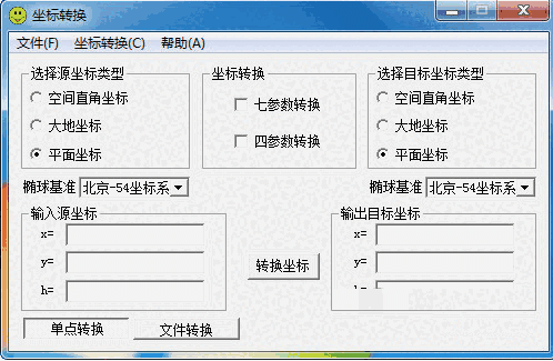 坐标转换是一款专业的坐标计算转换的工具软件。软件支持不同椭球基准的转换和不同基准的转换参数计算。软件的使用方法还是比较简单的:选择好源坐标类型、坐标转换方式、目标坐标类型,然后输入原坐标点击转换即可得到目标坐标,非常方便快捷。