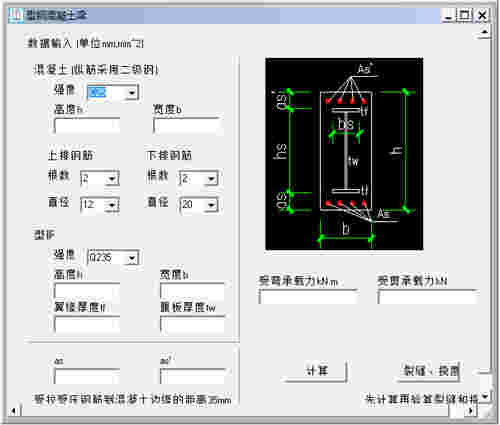 型钢混凝土梁计算软件是一款专业的型钢混凝土梁受弯和受剪承载力的计算工具软件。使用者可以使用软件通过输入型钢或混凝土的已知条件数据如高宽、上下排钢筋的根数和直径,强度等等来计算所受弯承载力以及受剪承载力。