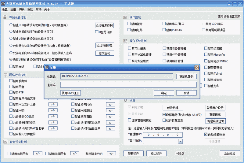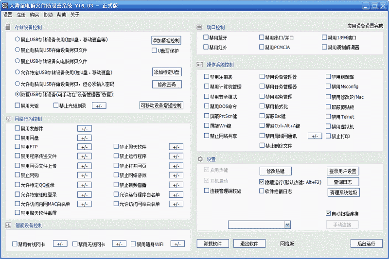 可以允许从电脑向U盘、移动硬盘拷贝资料,但必须输入授权密码否则无法拷贝。