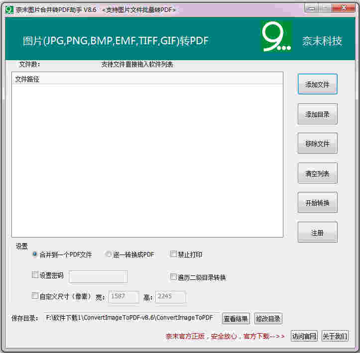 4、奈末图片合并转PDF助手官方版下方可设置合并转换或逐一转换、设置PDF像素、禁止打印、PDF密码等;点击“修改目录”,修改转换后图片的存放位置