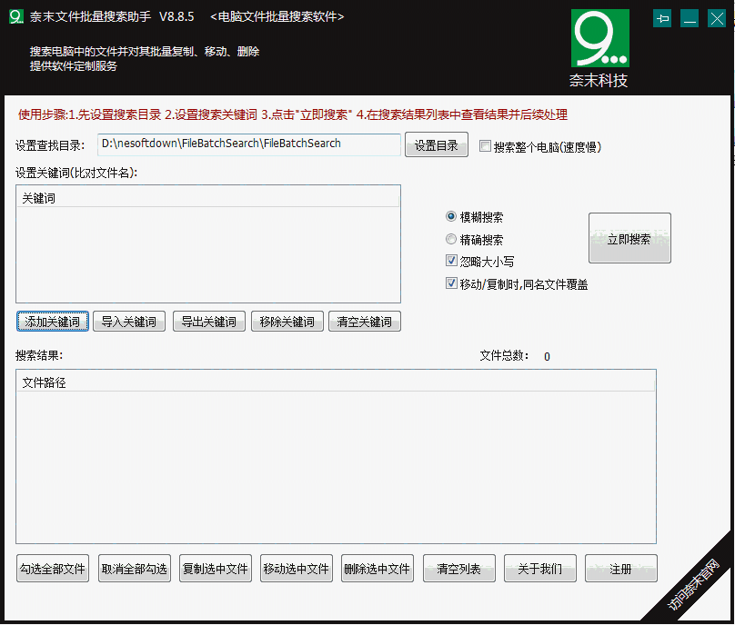 奈末文件批量搜索助手是一款专业的文件批量搜索的工具软件。使用者可以通过设定查找目录的范围内,点击添加关键词,根据关键词搜索匹配的文件。支持精确搜索和模糊搜索两种模式。软件支持对搜索的文件进行批量复制、移动、删除等操作。