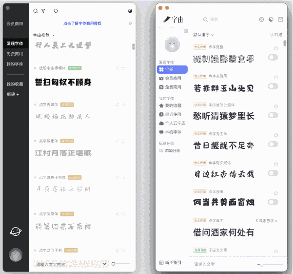 《字由》是一款能够帮助用户管理字体的工具,通过软件用户可以轻松安装、管理和分享字体,并可以查看字体的详细信息和使用授权,软件支持多种格式的字体文件,还提供了字体搜索和推荐功能,让用户可以更加快速地找到所需的字体,很适合用于设计。