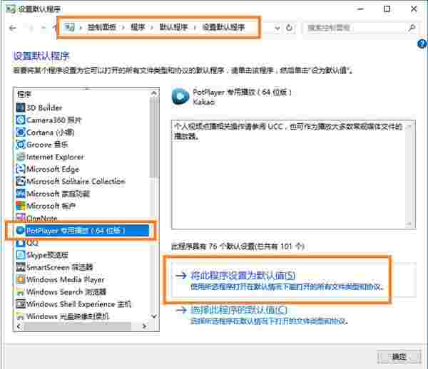 2、Win10系统,文件关联后要到控制面板“设置默认程序”才能完全生效,下图以PotPlayer为例(也可以在PotPlayer设置里“关联”-〉设置控制权)。
