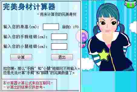 完美身材计算器是一款专业的标准身材的计算工具软件。使用者可以使用软件来计算自己的符合标准的身材,软件的使用方法还是非常简单的,输入身高、手腕粗细和小腿粗细的数值,点击计算即可获取标准身材数据,非常方便。