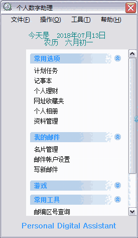 实创个人数字助理是一款专业的整合工具类的软件,软件支持个人计划任务、记事本、名片管理、邮件账户设置还可以玩五子棋等等功能。十分方便快捷,界面简约,布局直观清晰,操作简单,极易上手,是一款不可多得的利器。