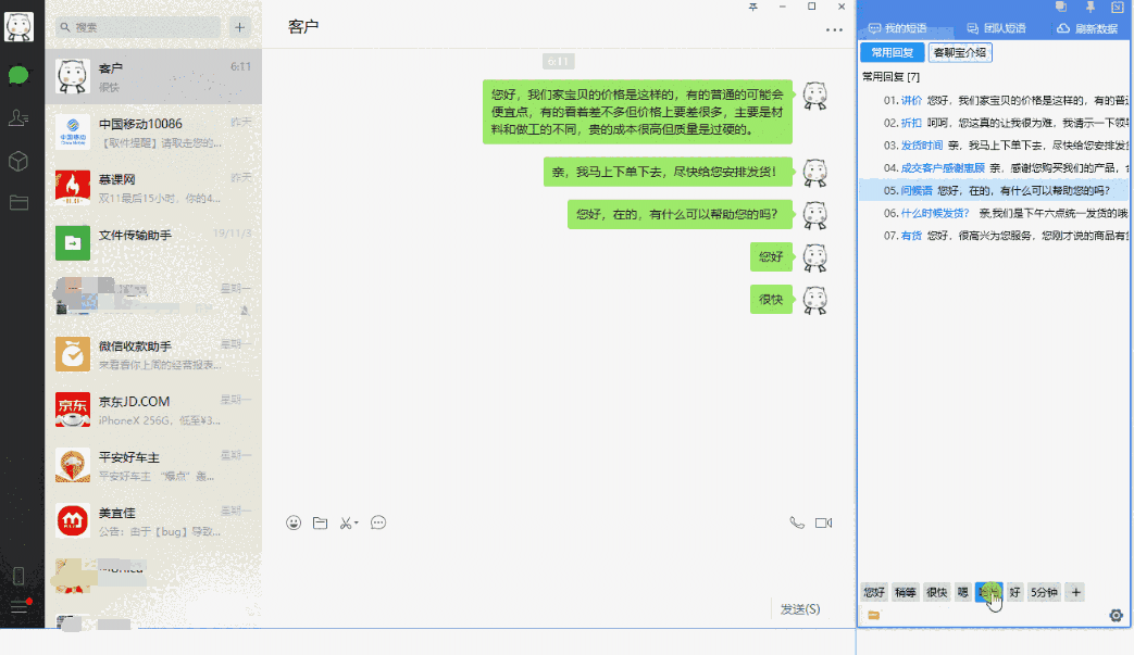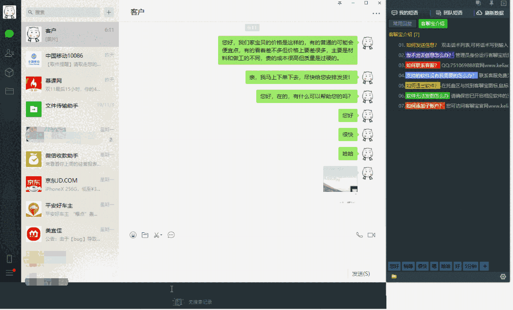 客聊宝客服聊天助手是一款专业的客服聊天辅助的软件工具,软件支持不同类型的文件发送、文案搜索、全局快捷键、多彩标签等等功能。非常方便快捷,软件界面简约,布局直观清晰。操作简单,容易上手,是一款十分实用的工具。