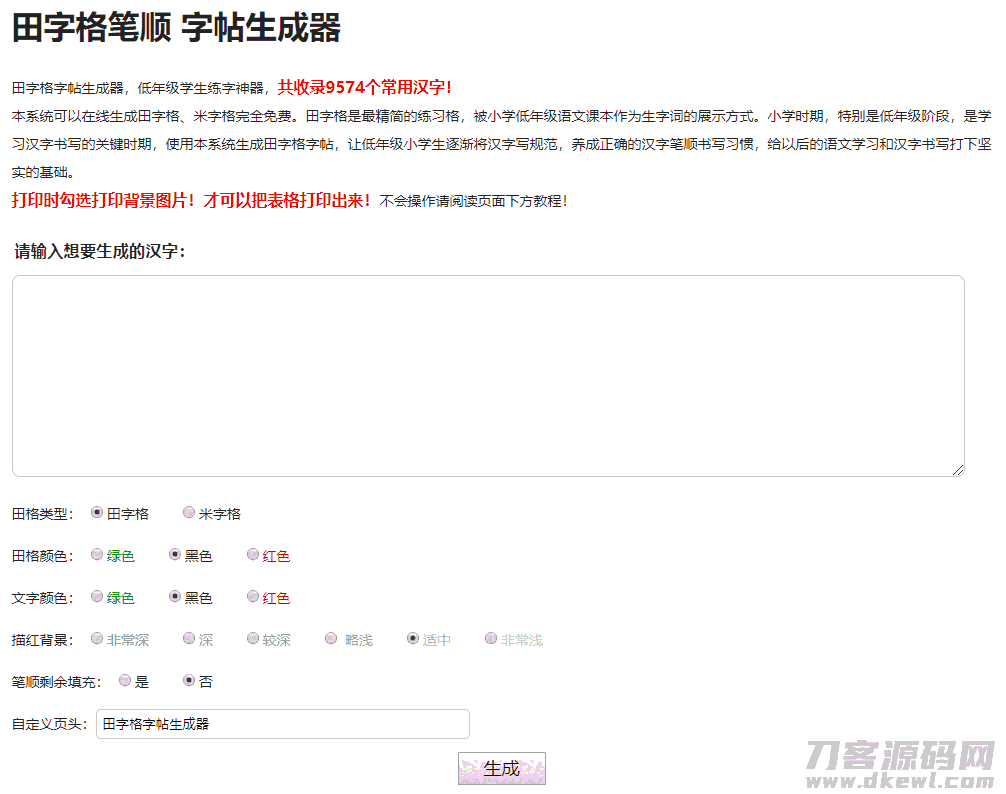 田字格笔顺生成,字帖生成器php版源码 ,共收录9574个常用汉字!
