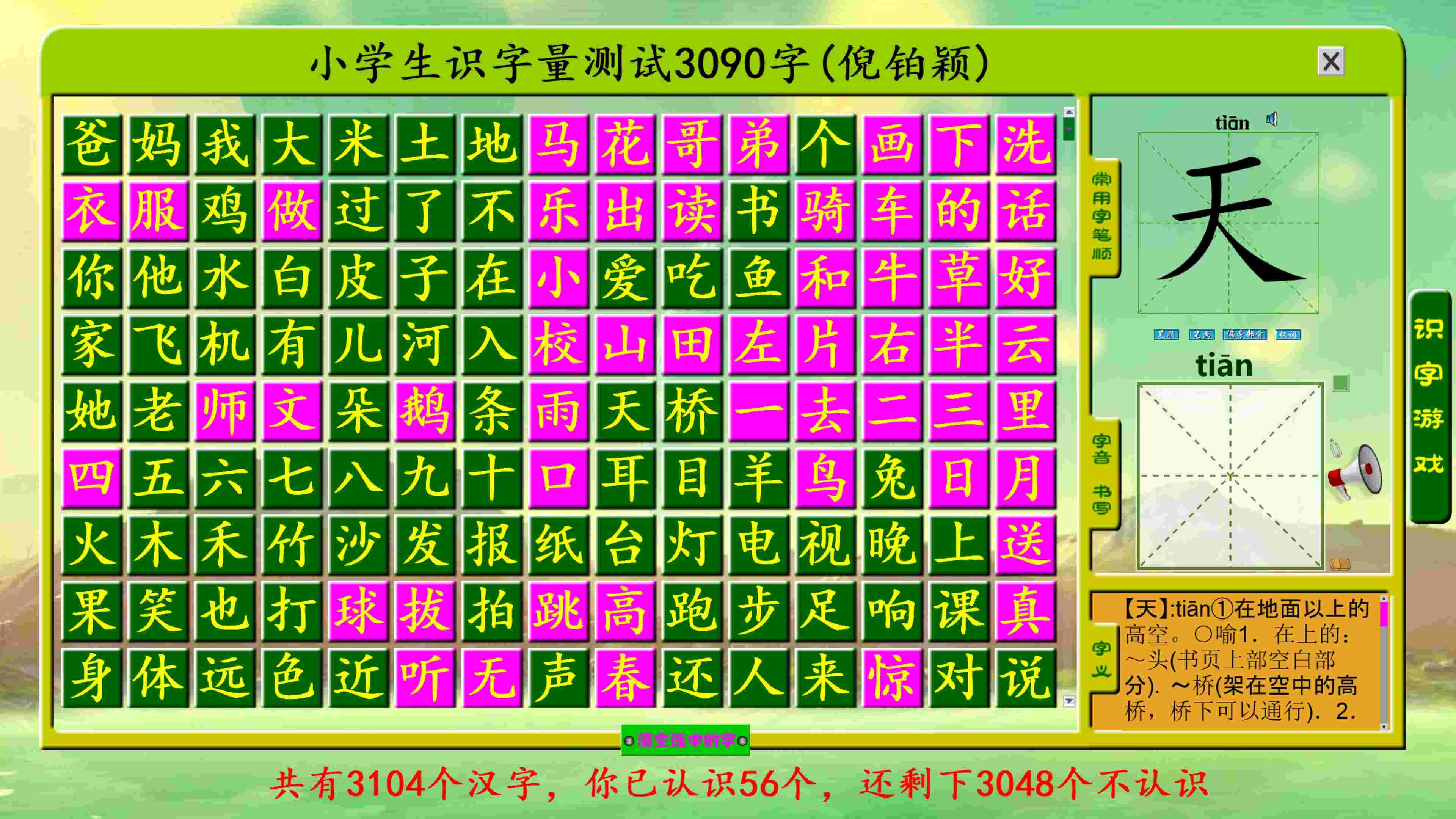 《小学生识字量测试》是一款方便易用的识字量测试软件,可以在电脑上测试你的汉字识字量,支持学前识字、小学生识字、中学生识字、成年人识字四个分类,内置字体笔顺、读音、书写、字义等信息,还有好玩的识字游戏帮你提高认字能力,增长汉字词汇量。